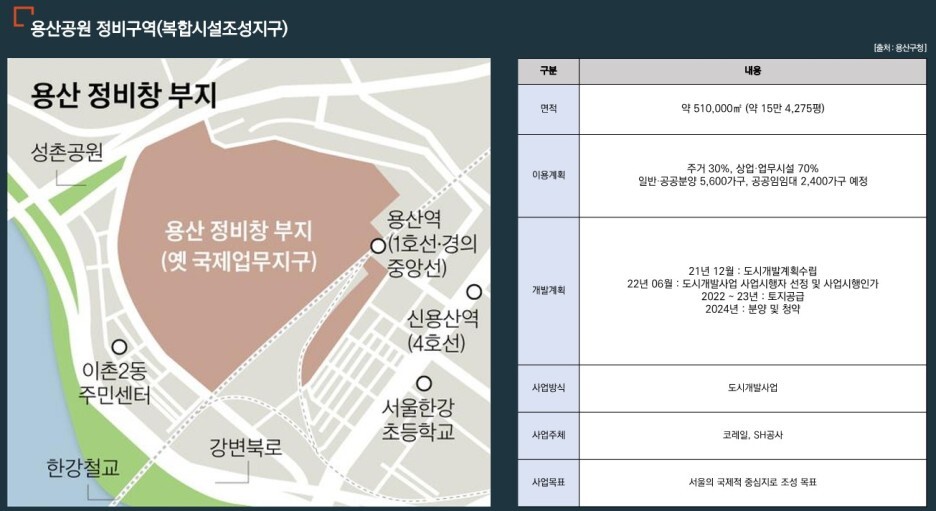 서울시 4대 전략 중심지 중 하나인 용산정비창 개발. 유 총사업비 31조 원으로 미니 신도시라 불리는 개발사업으로 8천 가구 공급 예정