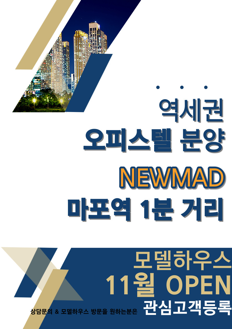 일과 주거의 경계 없이 새로움과 자유로움을 추구하는 뉴 노매드(NEW+NOMAD)를 의미하는 말해서 NEW와 MAD를 따서 뉴매드 (NEWMAD)라 이름을 지었다. 특히 역세권에 위치한 마포 뉴매드 오피스텔은 일과 주거의 경계선이 없이 자유로움과 새로움을 추구하는 사람들이라는 지향점을 가지고 창조적 사고와 업무 및 일상을 적절히 조화시키는 라이프스타일인 워라블을 최우선적으로 고려해 어디서도 볼 수 없었던 혁신적 상품 구성을 갖추었습니다. 오늘은 뉴노마드 시대의 주거 트렌드를 추구하는 역세권에 위치한 마포 뉴매드 오피스텔에 대해 알려드리겠습니다.