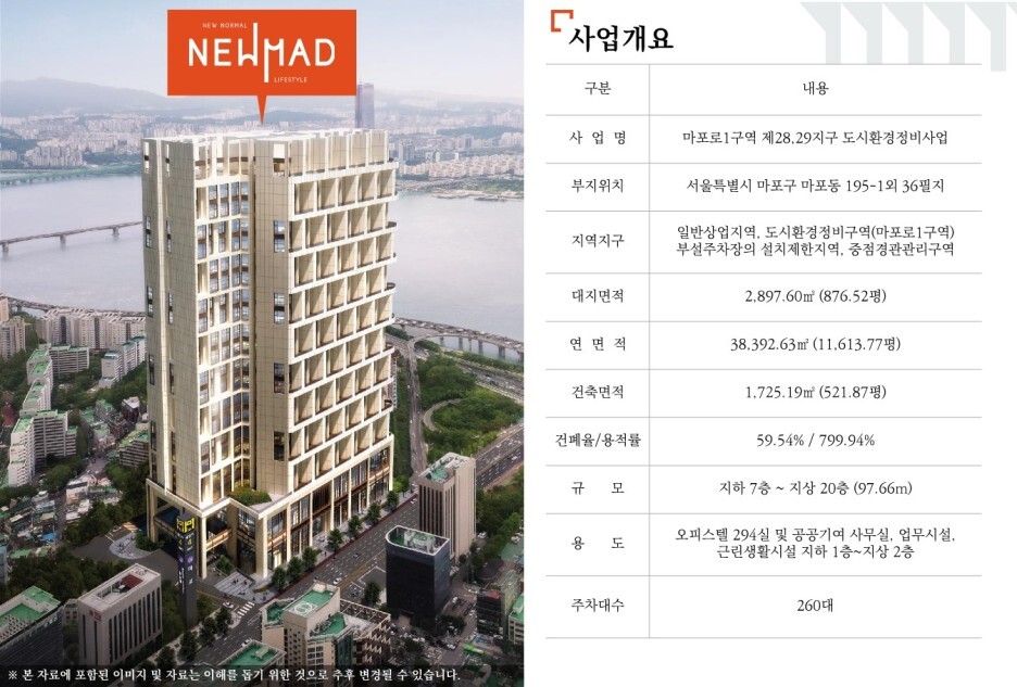마포 뉴매드 오피스텔은 서울특별시 마포구 마포동 195-1외 36필지로 지하 7층~지상 20층으로 지상 3층에서 지상 20층은 오피스텔로 전용면적 25~79㎡로 294실, 지하 1층에서 지상 2층은 근린생활시설로 조성된다. 주차 대수는 총 260대의 주차공간을 확보했습니다. 또한, 전 세대 복층구조와 광폭 테라스(일부세대), 친환경 마감재를 사용하였으며 어메니티 시설로 입주민을 위한 실내 수영장, 전용 고급 라운지, 피트니스가 마련되어 입주민의 수준 높은 워라블 라이프를 지원하며, 워크 라운지와 크리에이티브 스튜디오, 취미실 등도 조성할 수 있어 업무와 관련된 다양한 자기 계발 활동이 가능하도록 했습니다.