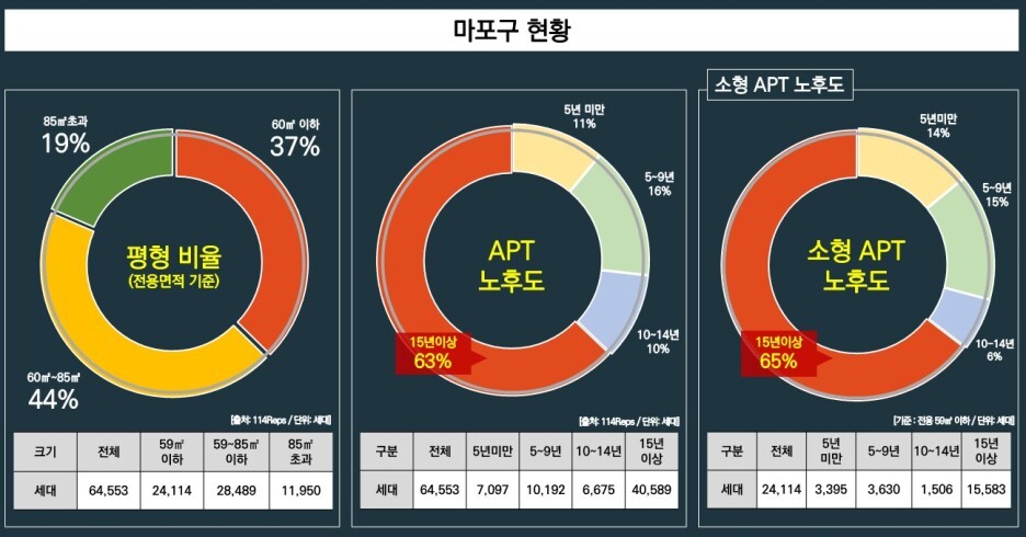 마포구 15년 이상의 노후된 아파트 비율이 63%(소형평형 노후도 또한 65%)로 신규 수요 유입 기대.
